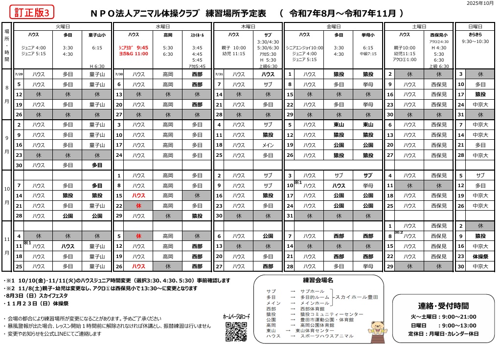 ヨガ:10月15日 休み→ハウス 、 10月22日 ハウス→休み